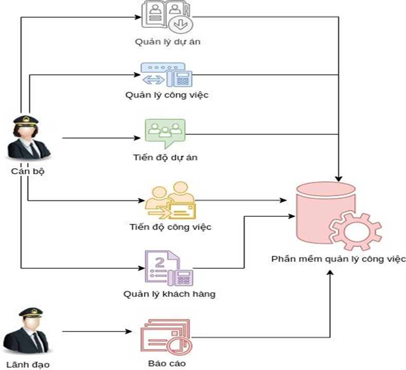 Module Quản lý công việc sẽ quản lý từ khi công việc được tạo, lịch thực hiện, các nhân sự phụ trách, nhân sự quản lý, khách hàng và tiến độ thực hiện Tiến độ dự án là module sẽ theo dõi tổng quan tất cả các dự án, tình hình thực hiện, các vấn đề, sự cố và phản hồi của khách hàng