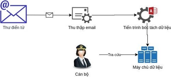 Cán bộ sẽ thiết lập các địa chỉ email nguồn và định dạng nhận biết các email sẽ thu thập bởi robot, khi có email mới robot sẽ tự động lọc và lấy dữ liệu với các email cần thu thập. Cán bộ sẽ nhận được thông báo khi robot thực hiện thu thập xong. Cán bộ sẽ vào rà soát và xác nhận hoặc chỉnh sửa dữ liệu nếu thấy cần thiết.
